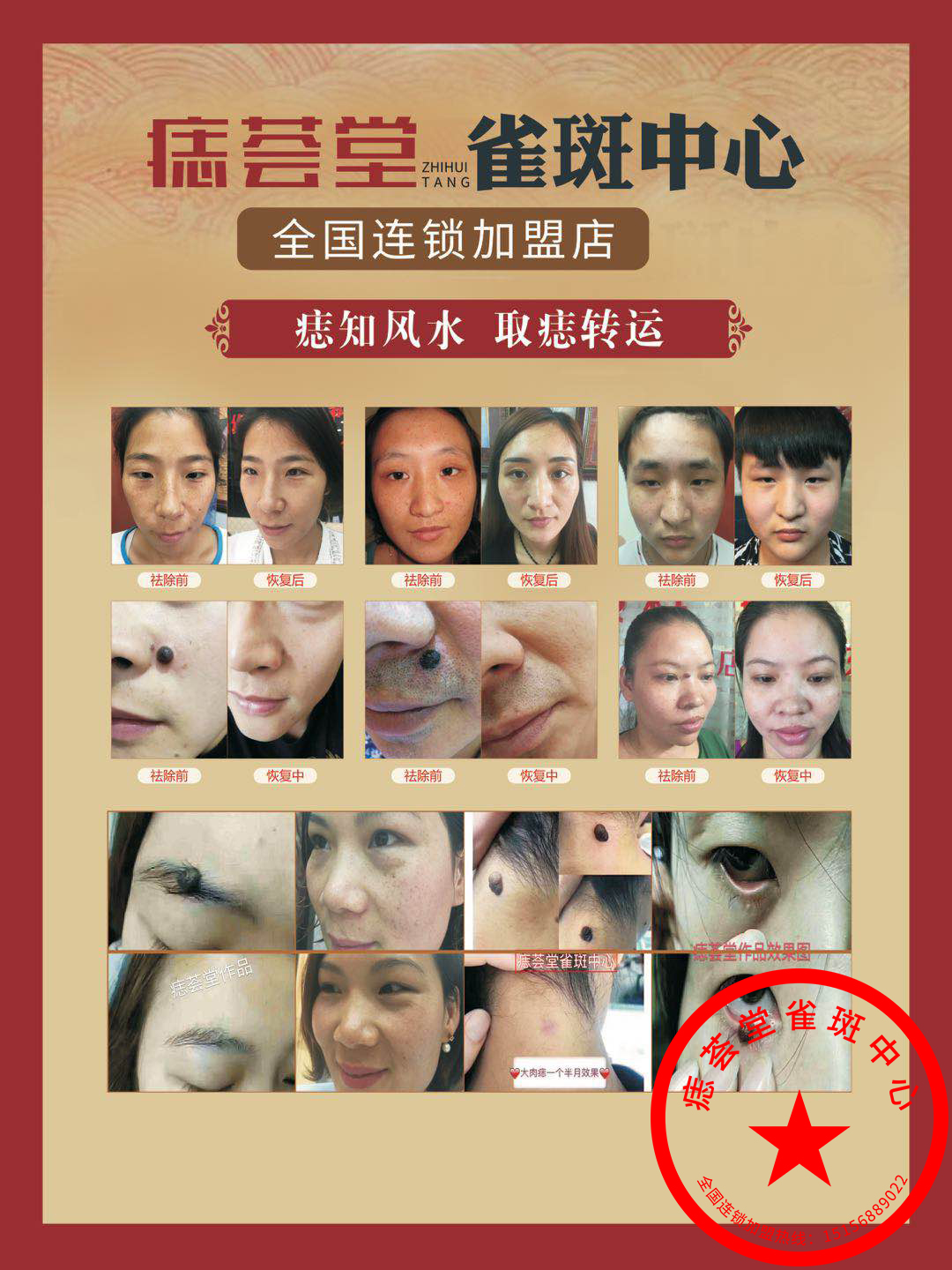 痣荟堂中草药取痣,采用独门秘方,所以取痣的过程和效果和别的取痣方式、效果没有可比性,比激光去痣、普通药水点痣效果更好,注意事项最少,是一种安全高效的取痣方法。痣荟堂不仅仅提供取痣服务,这里还可以为大家解决斑(雀斑、色斑、老年斑、激素斑、铅汞斑等)、痘(青春痘、成人痤疮)、疣(扁平疣、矢状疣、寻常疣、汗管瘤)等皮肤问题。
