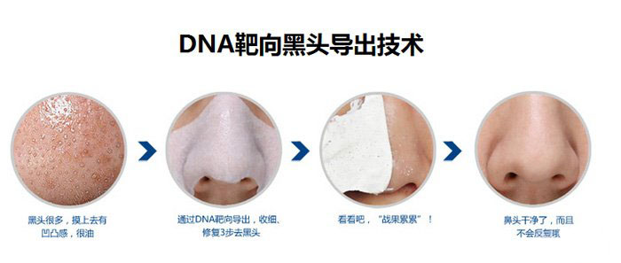 运用医学的基因靶向修复技术,配合DNA原液,软化黑头,强力吸附并导出毛孔油垢污物,同时收细毛孔,防止黑头再生。