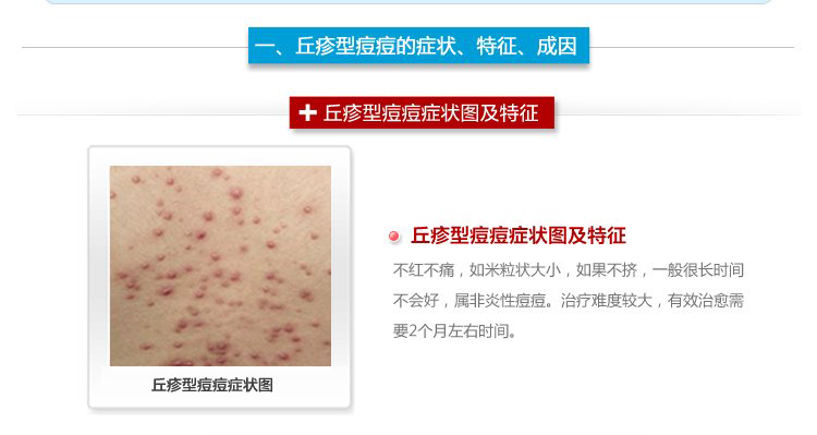 丘疹型痘痘是因为皮损导致炎性的小丘疹为主,小米至豌豆大的坚硬的小丘疹,呈淡红色至深红色。丘疹中央可有一个黑头粉刺或顶端未变黑的皮脂栓。